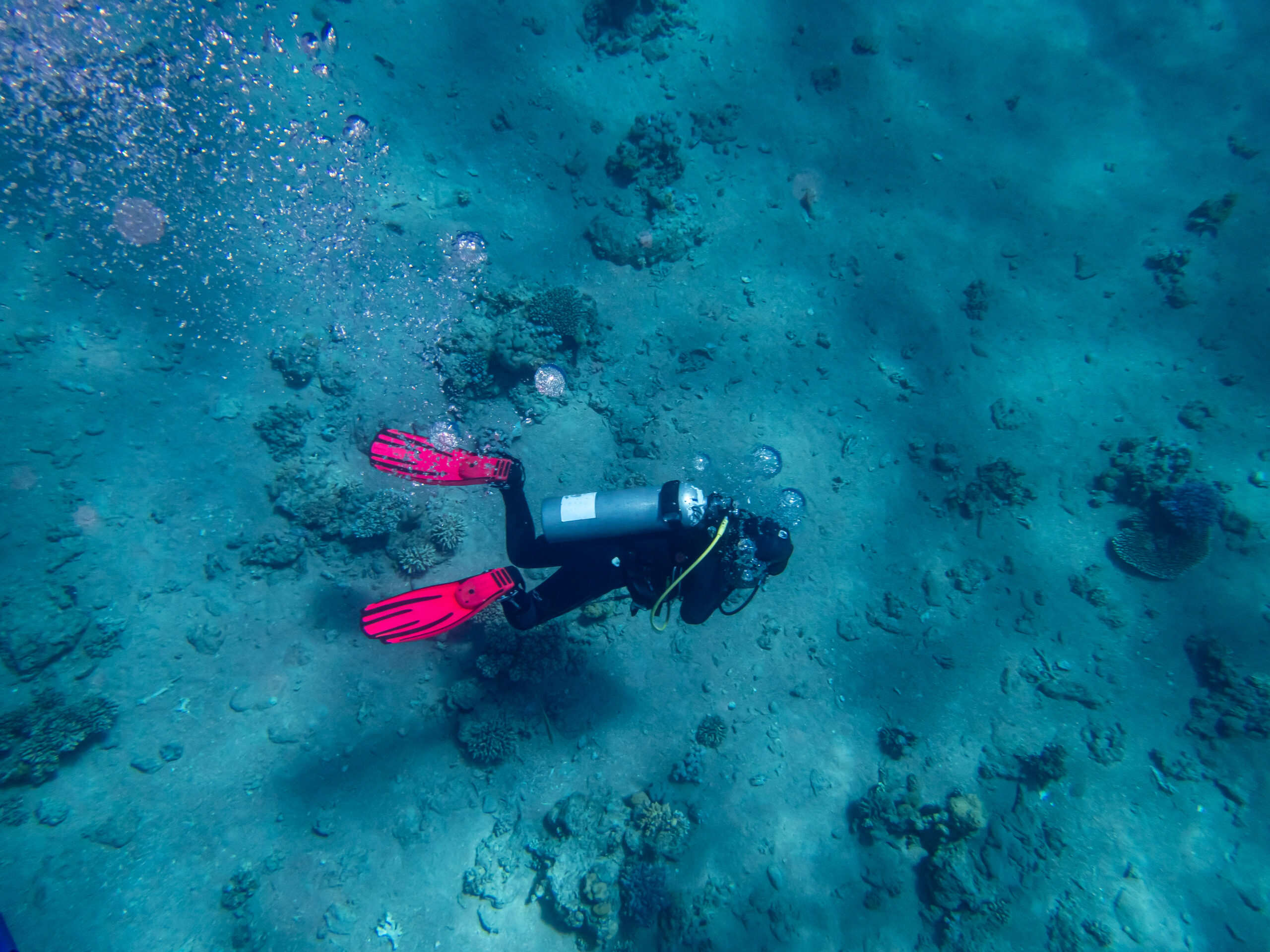 Since people breathe at different rates and as you go deeper you take in air faster, divers carry a gauge that lets them know how much air is in the tank. Usually, divers in calm, warm water from 5-10 metres/ 15-30 feet are able to spend about one hour underwater with an average tank.
