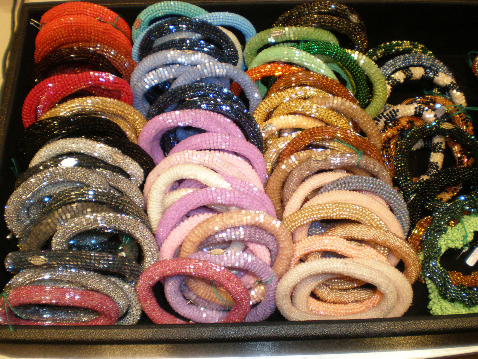 Best selling pieces are the simple soft bracelet — very wearable — available in a kaleidoscope of colors, a classic knot necklace and sphere earrings. All excellent choices but why go safe? I’d spring for one of the more outrageous pieces encrusted with beaded shells or festooned with beaded cherries.