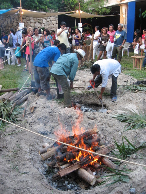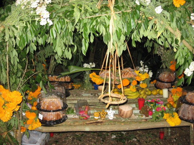 Because we visited on Day of the Dead, it was a uniquely wonderful experience. We were allowed to join the villagers who watched the local shaman, a kindly looking older man dressed in a pristine white cotton tunic and pants, perform many rituals including blessing the altar, the pib (fire pit) for the mucbil pollo, while accompanied by musicians wearing feathered headdresses, loincloths, with painted faces and bodies, playing instruments made from wood, stone and dried animal hides.