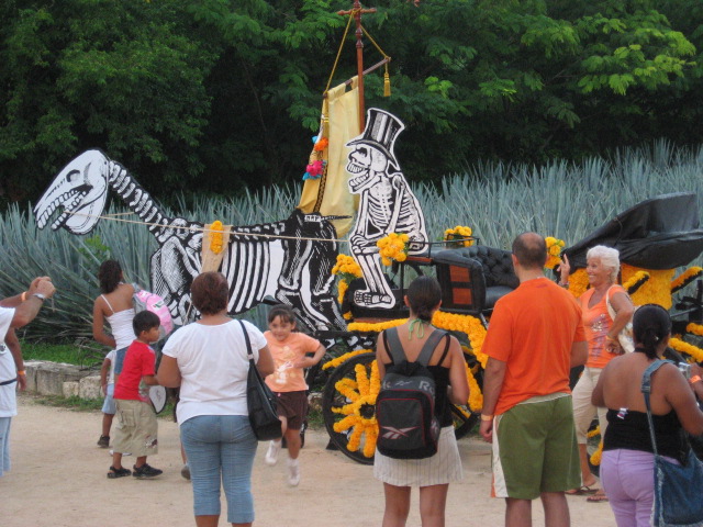 One of the splashiest celebrations can be found at Rivera Maya’s Xcaret cultural theme park, when they host their annual Festival de la Vida y la Muerte, “Festival of Life and Death”, which is recognized as a “Masterpiece of Oral and Intangible Cultural heritage” by UNESCO. The event runs from October 30th to November 2nd, and is a crazy quilt of live theater, concerts, colorful costumes, handicrafts, parades, and a wonderful “graveyard” filled with the replicas of the most humorous altars that are actually found in neighboring cemeteries, as well as many other symbolic rituals. Before you get started, take advantage of the make-up stands (the locals are happy to offer beauty tips) to paint your own black and white Day of the Dead face.