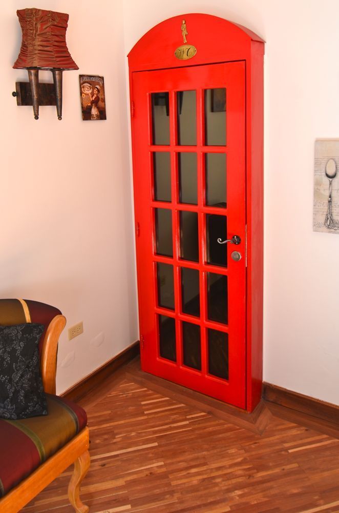 Adjacent to the dining room is a small, cozy bar that is a nice place to have a drink in the evening. The red phone-booth door to the WC closet (bathroom) is an unexpected, fun and quirky touch.