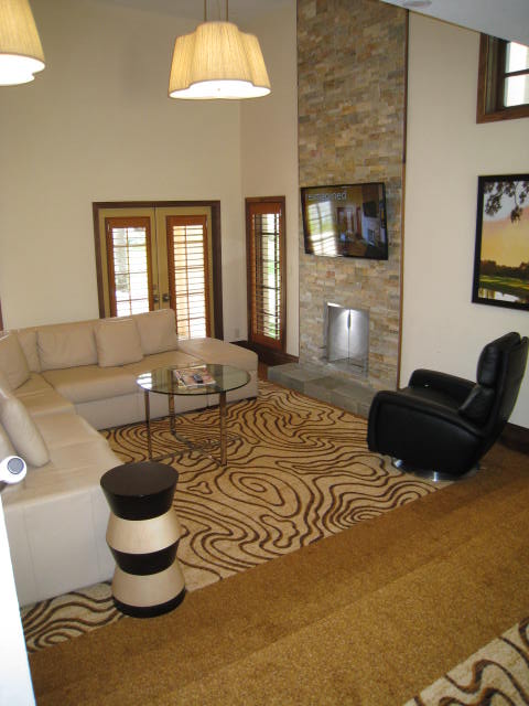 Modern nature-inspired décor is the dominating theme. The walls are covered in a hip Zebrano wood and natural Shabui stacked stone with a pleasing palate of cream and chocolate color accents. The carpeting is custom, quality originals by Axminister of England. Each woven masterpiece integrates a creative topographic map of the golf course and resort grounds in its design. The beds are stylish and inviting featuring beautifully upholstered headboards, 300 count linens, plush pillows and ingenious bedside ambient lighting that ensures your safety if you need to get up in the middle of the night.