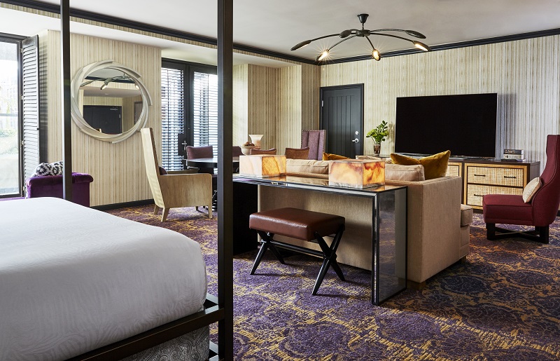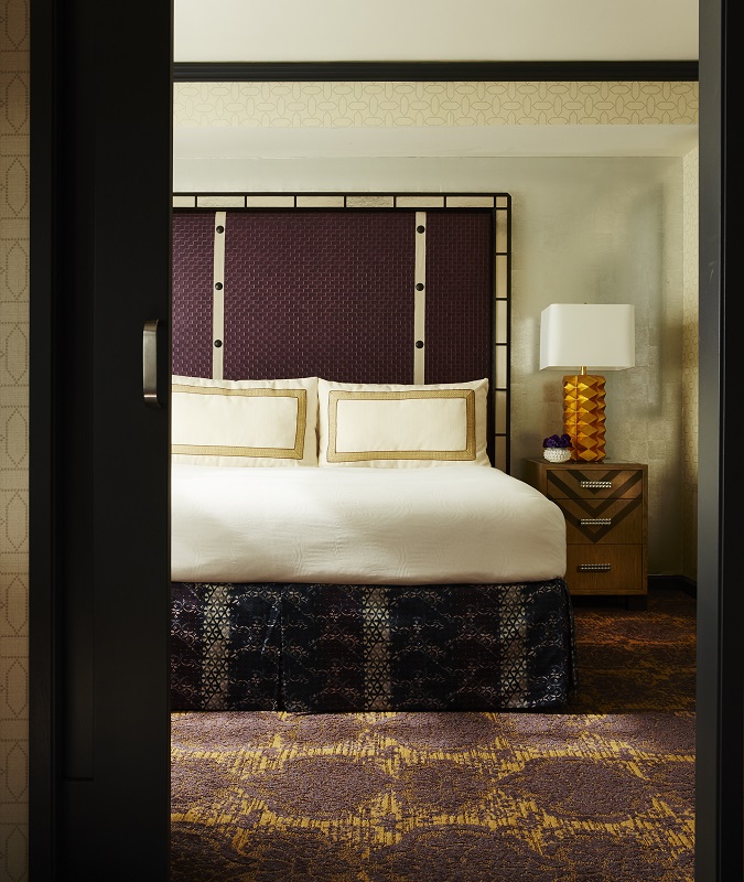 The hotel property stays true to Southern California style but with an eclectic modern twist. Elements include woven vinyl headboards, unique lighting and distinctive furniture pieces. Wall and trim accents showcase rich textures and stylistic geometric patterns.