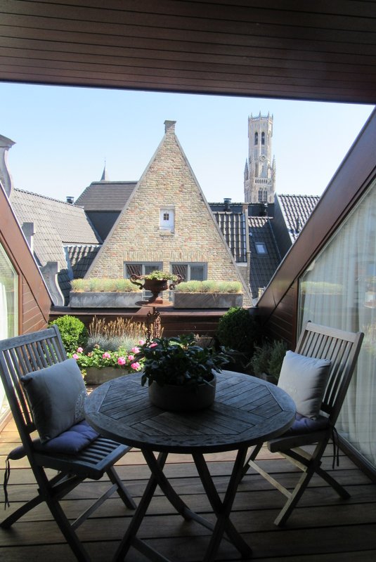 Enjoy the magic of the city and the carillon music of the belfry tower from the small sundeck for two on the top floor. The secluded space is the perfect spot for shared conversation and a little romance.