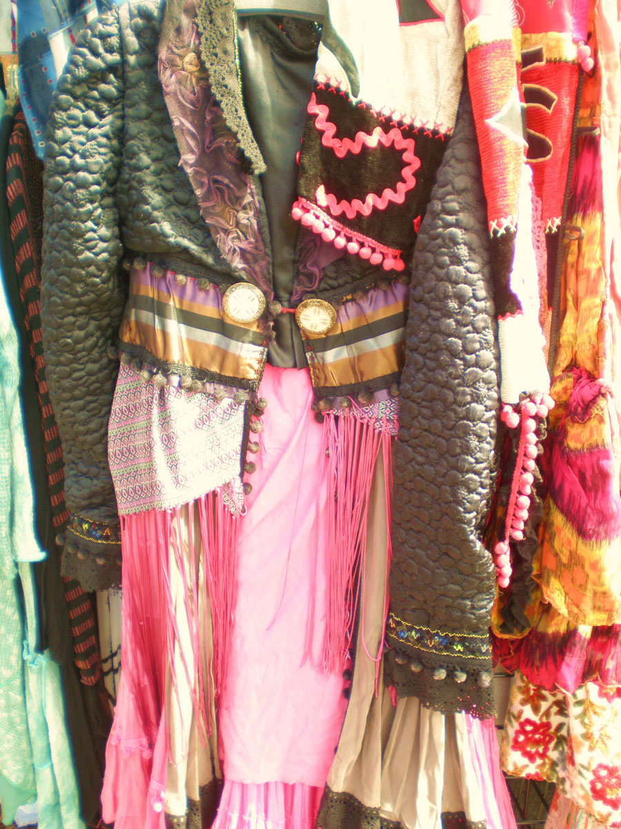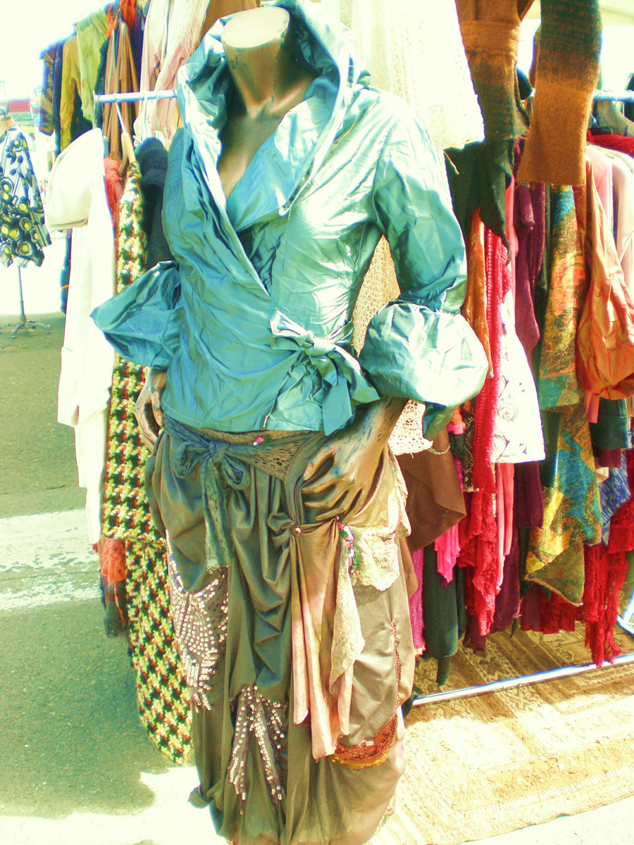 Danski must have been a creative Thumbelina: she tells me she was collecting fabrics at the young age of 13. Her outfit on this day consisted of black and white tie-dyed pants, a patchwork coat in earth colors and Carly Simon-esque floppy hat. Her creations evoke fantasy and whimsy – many of the skirts and wraps reminiscent of something imagined for a fairytale wood nymph.