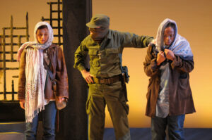 L to R: A militiaman (A.C.T. core acting company member Manoel Felciano) apprehends Nawal (Marjan Neshat, left) and her friend Sawda (A.C.T. Master of Fine Arts Program graduate Omozé Idehenre) when he suspects them of being notorious revolutionaries, in the West Coast premiere of Wajdi Mouawad’s Scorched, playing at the American Conservatory Theater through Sunday, March 11, 2012. Photo by Kevin Berne.
