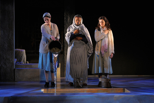 L to R: After the death of Nawal’s grandmother, Nawal (Marjan Neshat, right), her mother, Jihane (Jacqueline Antaramian, left), and village midwife Elhame (A.C.T. Master of Fine Arts Program graduate Omozé Idehenre) participate in a traditional burial ceremony, in the West Coast premiere of Wajdi Mouawad’s Scorched, playing at the American Conservatory Theater through Sunday, March 11, 2012. Photo by Kevin Berne.