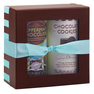 - Peppermint or Strawberry (or both!) Cuppa Chocolate and cookies: Tea time often includes treats – and who doesn’t love chocolate? The Republic of Tea has an excellent idea with these gift sets. Both include a package of thin chocolate cookies and a different variety of a Roobios (red) caffeine and calorie-free tea. It’s holiday season and everyone is in the mood for something sweet.