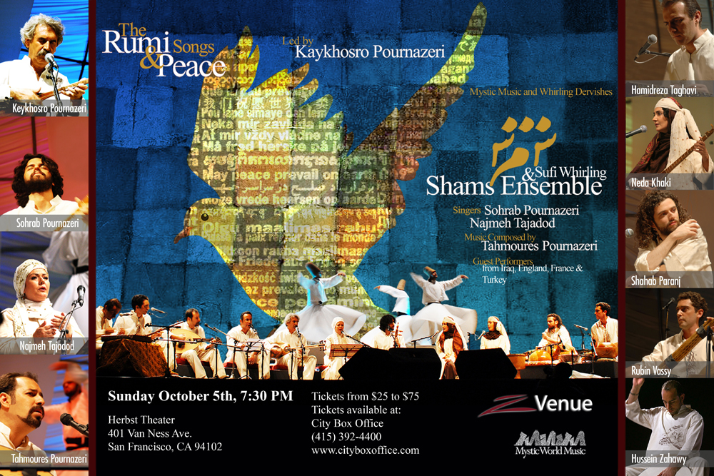 Shams Ensemble will perform for one night only in San Francisco on Sunday, October 5 at 7:30pm at Herbst Theater. On tour from Iran, this is the first musical performance group to publicly feature female vocalists as well as dancers since the revolution of 1979.